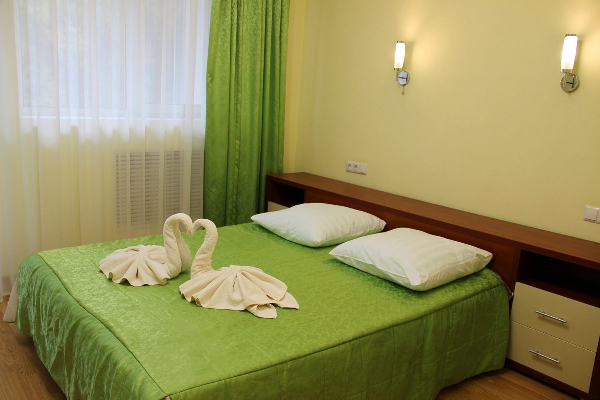 В номере: двуспальная кровать, прикроватные тумбы, стол, стулья, шкаф, тахта, телевизор, холодильник, электрочайник, утюг с гладильной доской, сушилка для белья, набор посуды